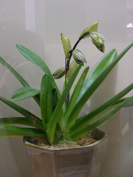 並んでいたのはパフィオペディラム・ロスチャイルディアナムと富貴蘭・春蘭でした。さすがに立派な株,東洋蘭のほうは器も含めて観賞するもののようです。パフィオは大きな蕾がついていて,咲いたらさぞかし立派だろうと想像できますが,残りの2つは株だけでそこまで値打ちのあるものか悩んでしまいそうです。一緒に並んでいたおじさまが「枯れたらそれまでだよね」とおっしゃっておられましたが全くその通りで管理するのも命懸けになりそうです。